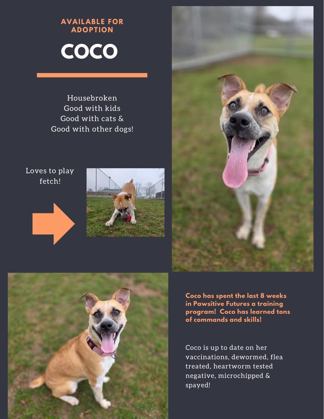 Coco is up to date on her vaccinations, dewormed, flea treated, heartworm tested, microchipped & spayed!